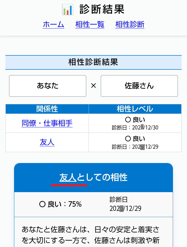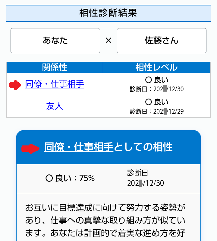 同じ画面で関係性をクリックすると、その相性診断の結果が表示される。