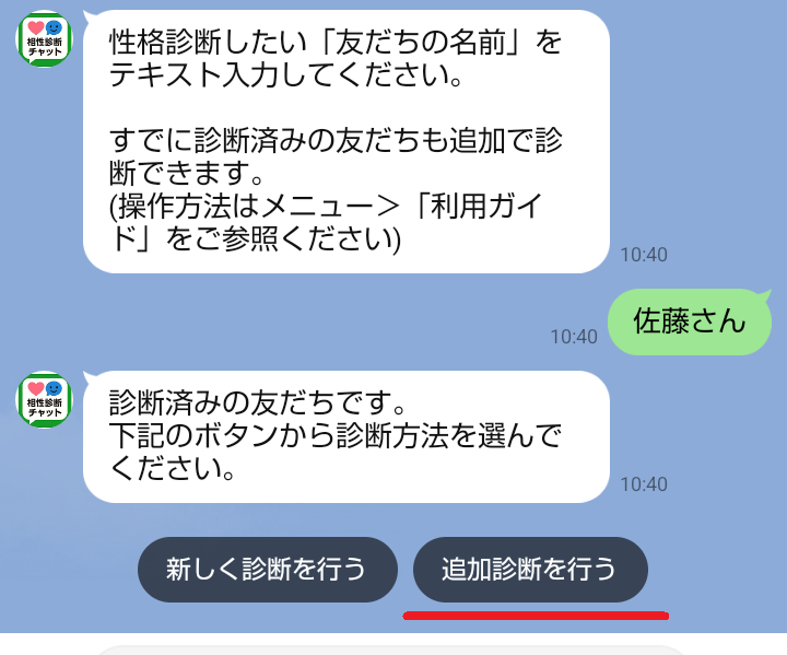 LINEメニュー>[ 友だち診断 ]で、すでに診断済みの友だちと「同じ名前」を入力する。