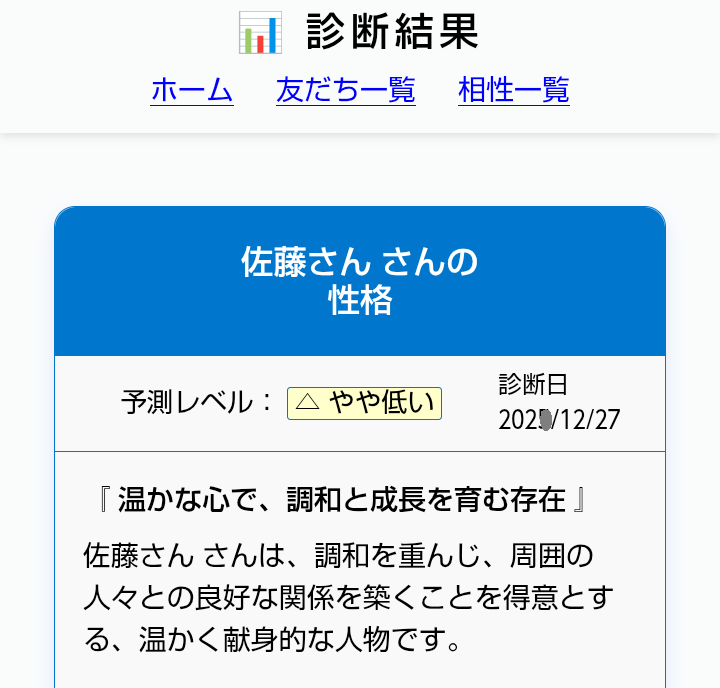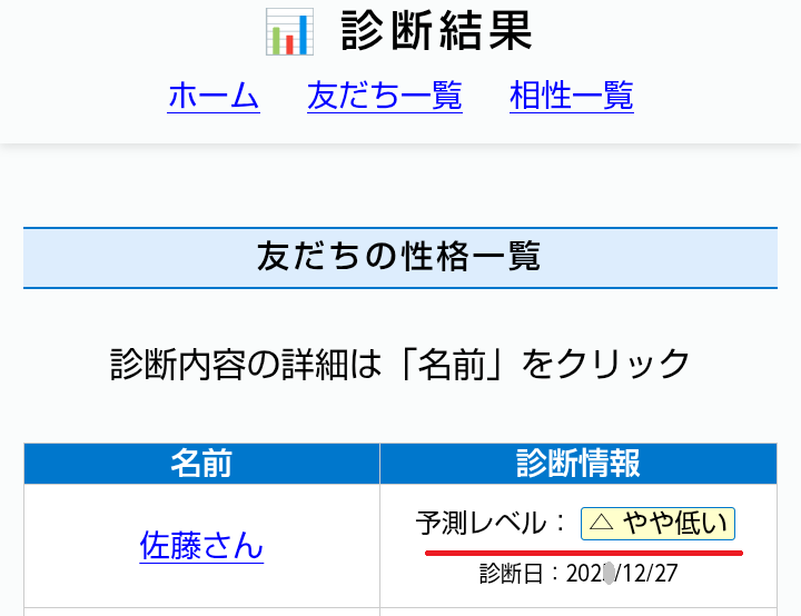 友だち診断の「予測レベルが低い」場合は、友だちの性格とは違うものとなります。