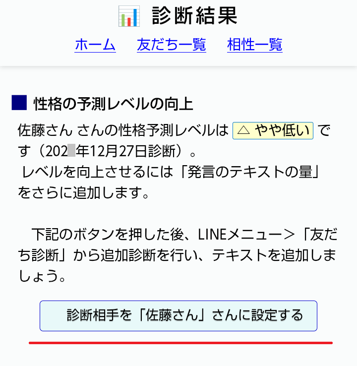 ※友だちの診断を更新すると、予測レベルと診断日も更新される。