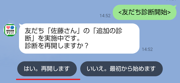 LINEメニュー>[ 友だち診断 ]を押して、返信メッセージに対して [はい。再開します]を押す。