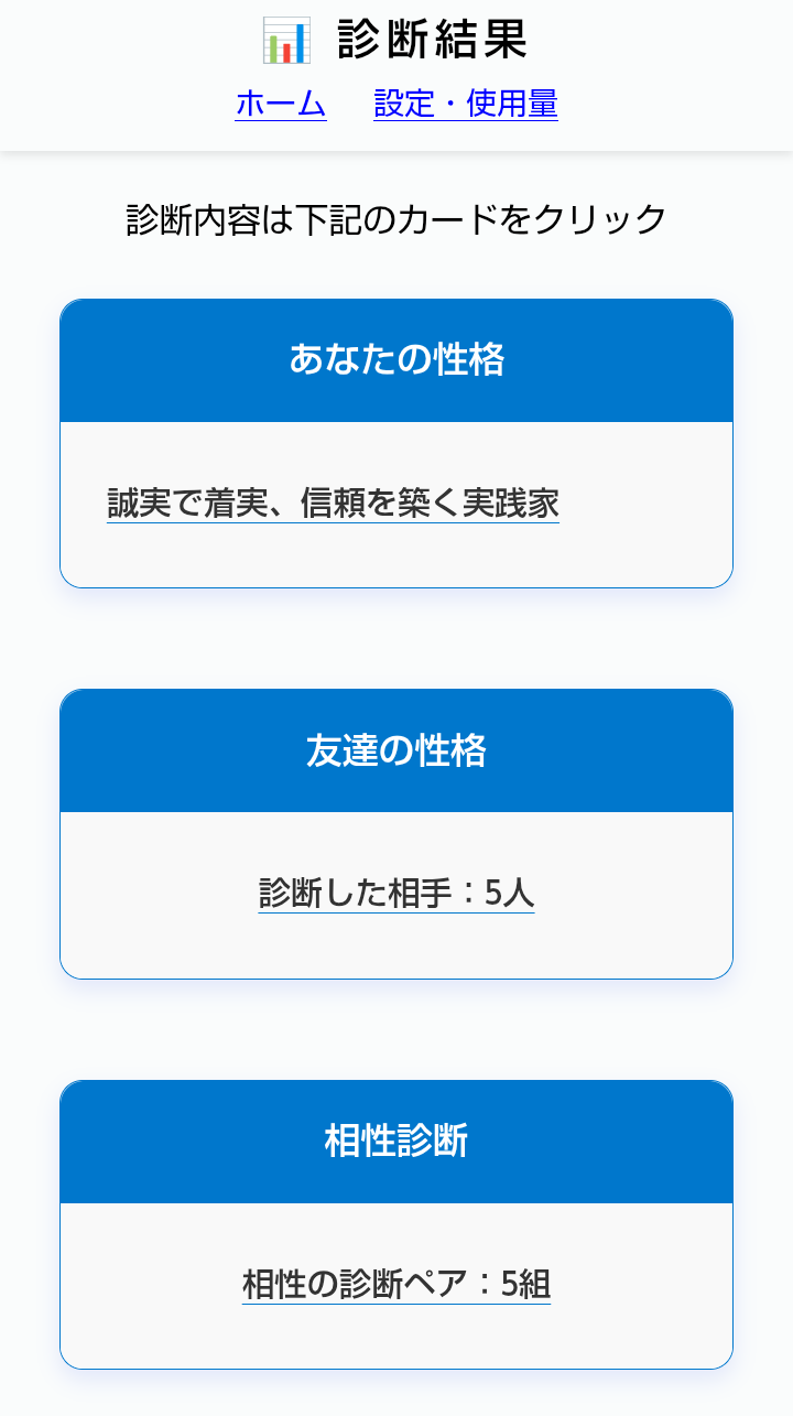 それぞれのカードをクリックすることで、結果の画面に移動する。