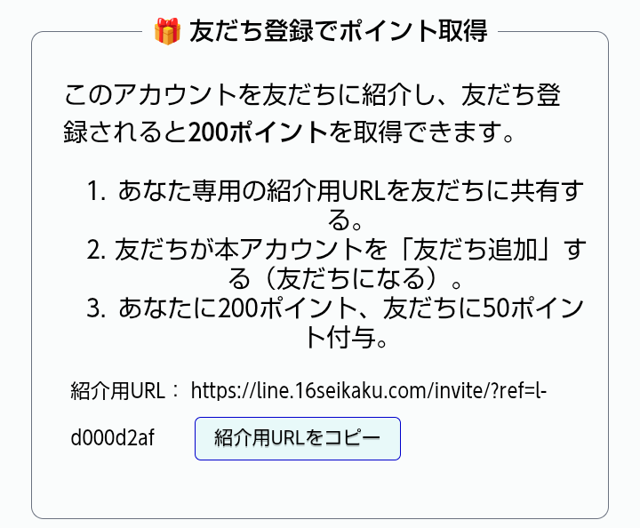 あなた専用の紹介用URLをコピーして、友だちにシェアする(紹介する)。