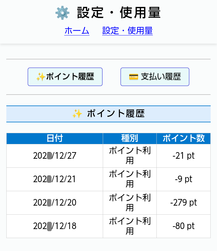 「ポイントの使用履歴」のラジオボタンを選んで、「選択を実行」すると、ポイント利用と購入の履歴が表示される。
