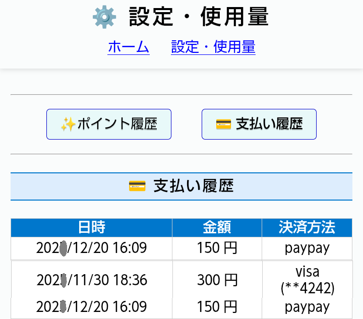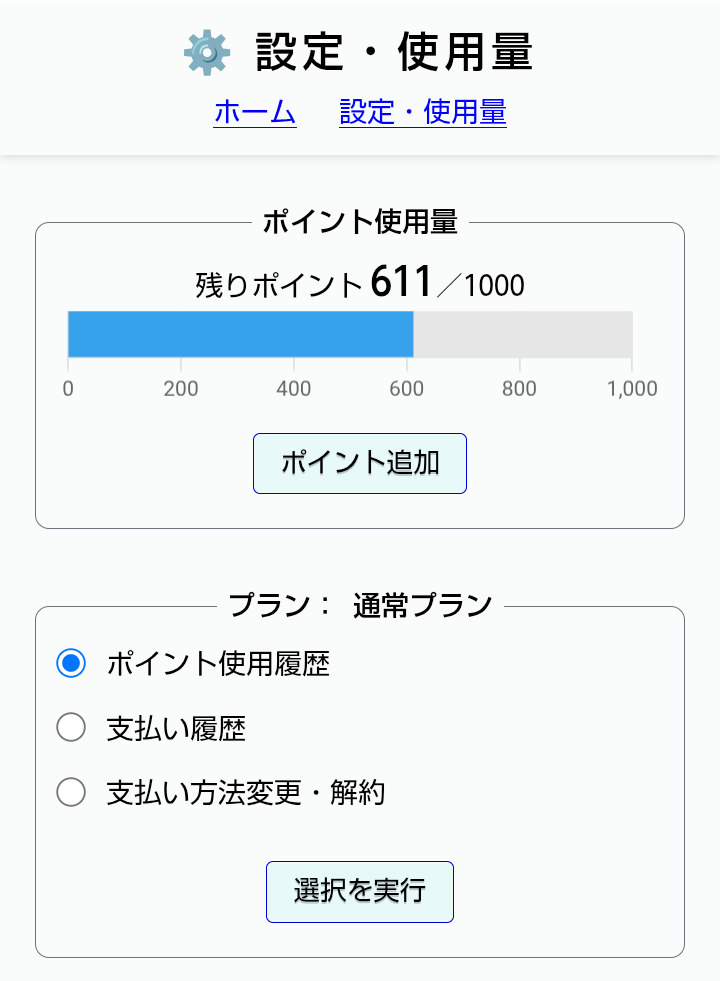 お支払い履歴は[設定・使用量]の画面で「支払い履歴」のラジオボタンを選んで、「選択を実行」で表示される。