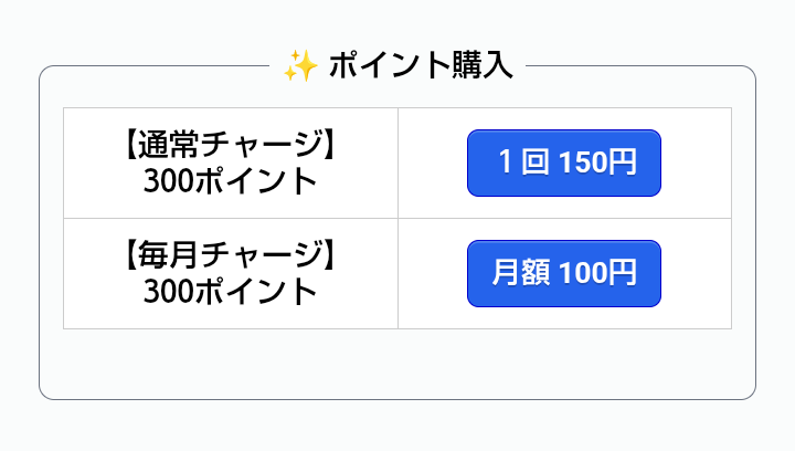 ポイントの購入方法は「都度購入(通常チャージ)」と「定期購入(毎月チャージ)」。